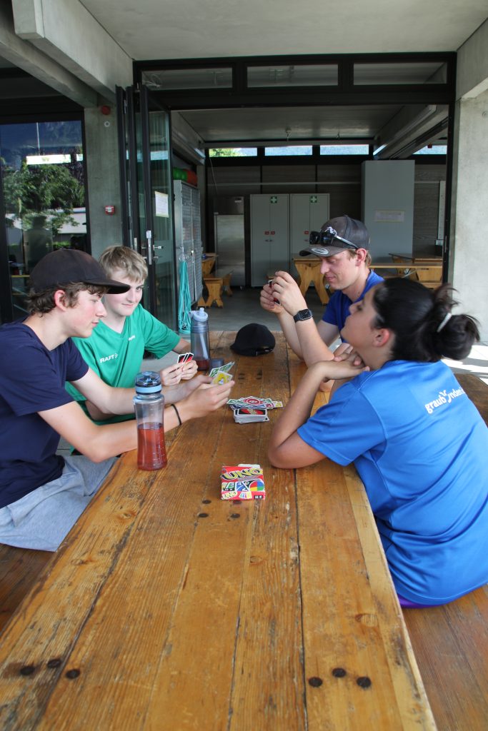Nachdem wir gefrühstückt hatten, machten wir uns auf den Weg zu unseren gewählten Sportarten. Von Tennis zu Klettern war alles dabei. Nach einer kleinen Stärkung am Znüni Buffet gings weiter. Nach dem leckeren Mittagessen, was übrigens Riz Casimir war, machten wir uns an unsere Hauptsportarten. Danach erfrischten wir uns noch im kalten Wasser am See. Nach dem leckeren Abendessen und einem tollen Lagertanz gingen wir ins Bett.